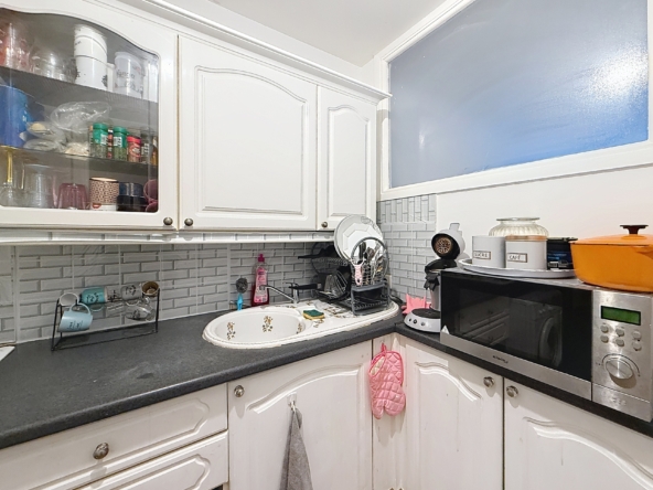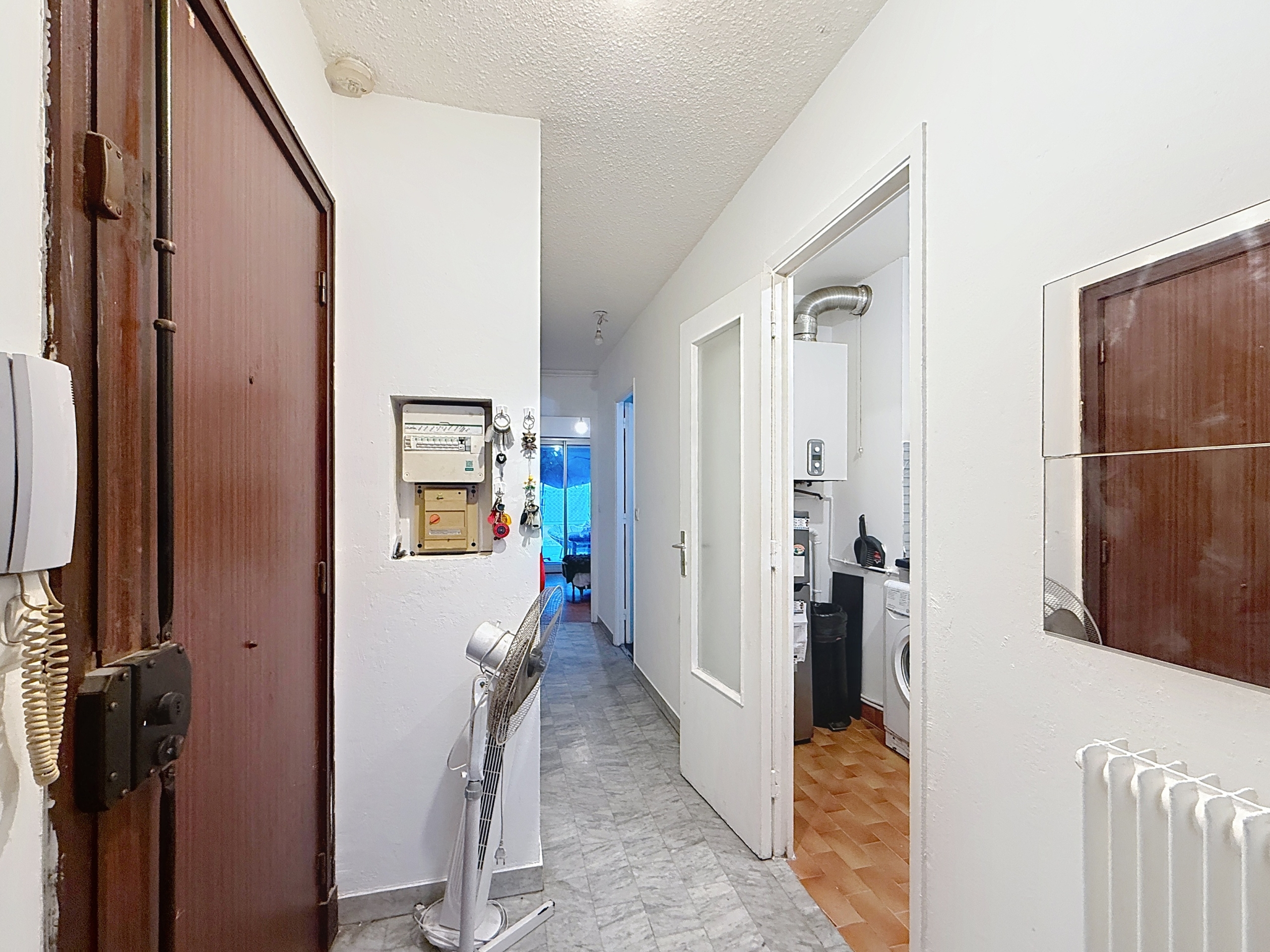 Le séjour, exposé sud/ouest, s’ouvre sur un balcon de 4,40 m² par une large baie vitrée. Le bien comprend une entrée avec placard, une chambre parquetée au calme, côté terrasse, une salle d’eau récente avec wc, et une cuisine indépendante aménagée (sans fenêtre).