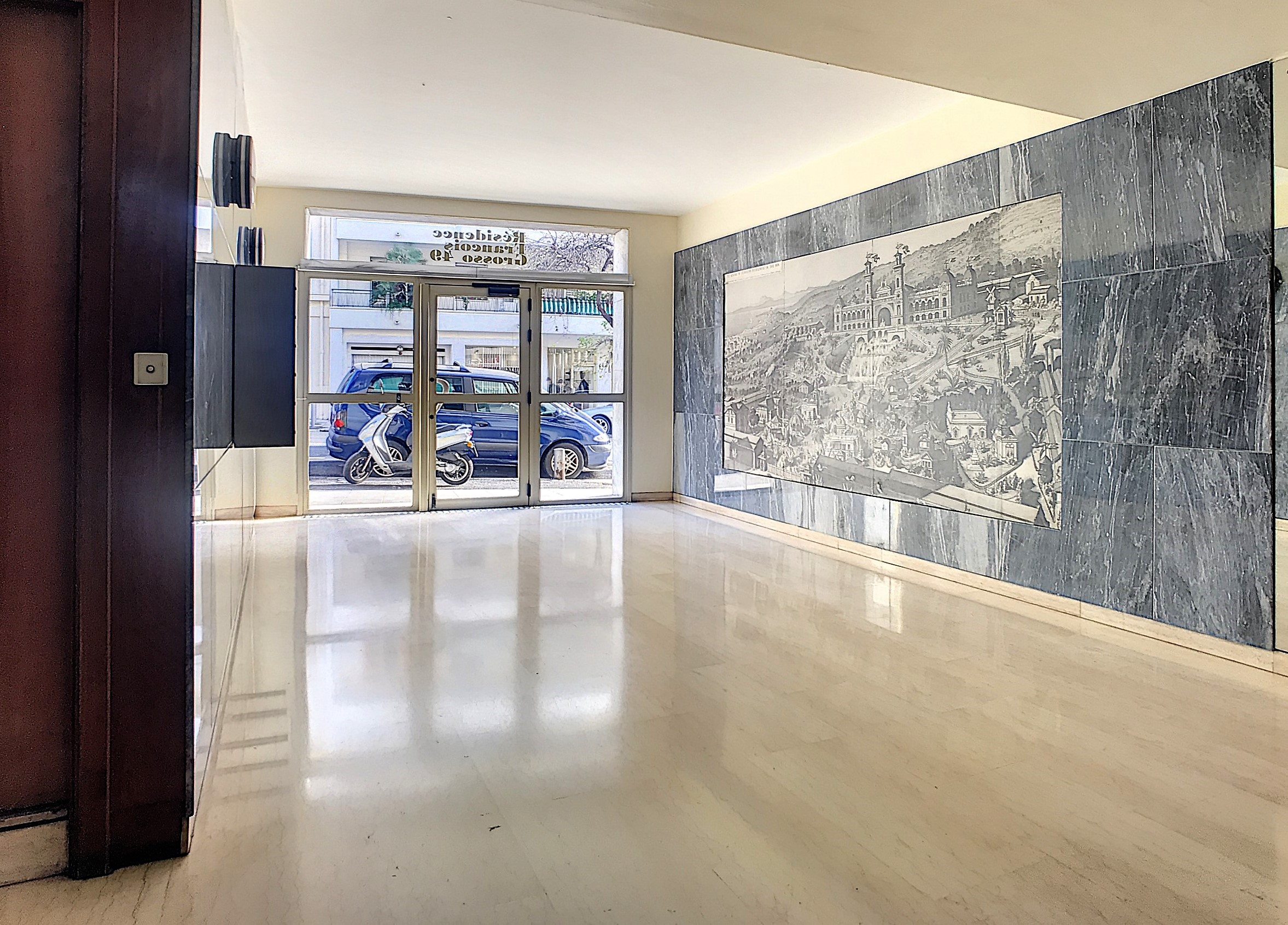 L’immeuble, construit en 1965, est est soigneusement entretenu et dispose des services d’une gardienne. Son vaste hall d’entrée, orné d’une gravure de l’Exposition internationale de Nice de 1884, confère au lieu un certain cachet.