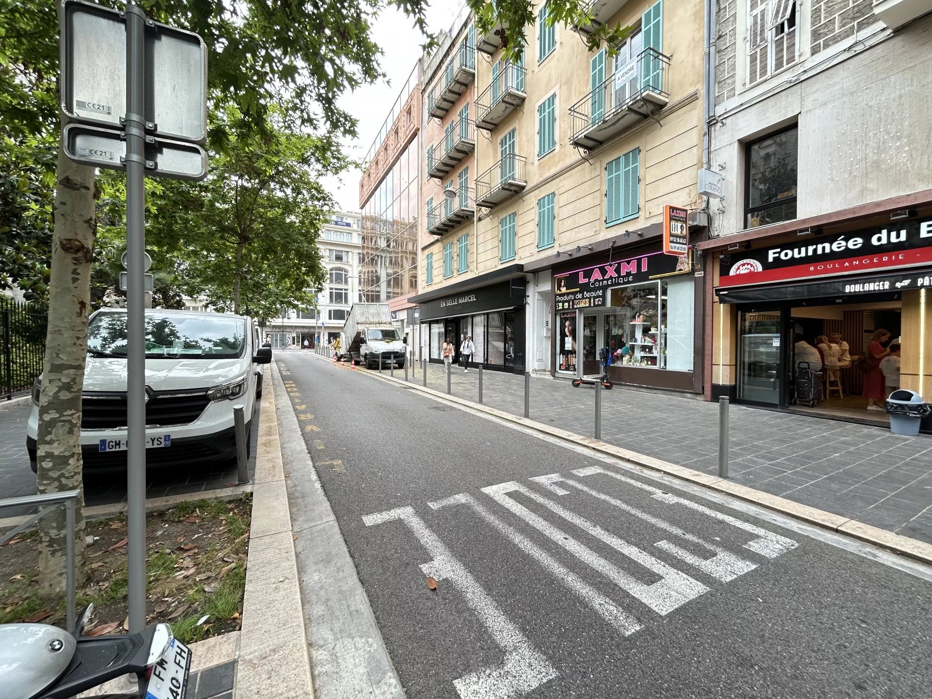 Le centre commercial NICETOILE, avec ses 100 boutiques, est littéralement au bout de la rue. Les Galeries Lafayette de la Place Masséna et les enseignes de luxe de la rue Paradis complètent cette offre shopping haut de gamme. C'est l'un des meilleurs emplacements de la Côte d'Azur pour les amateurs de mode et de design.