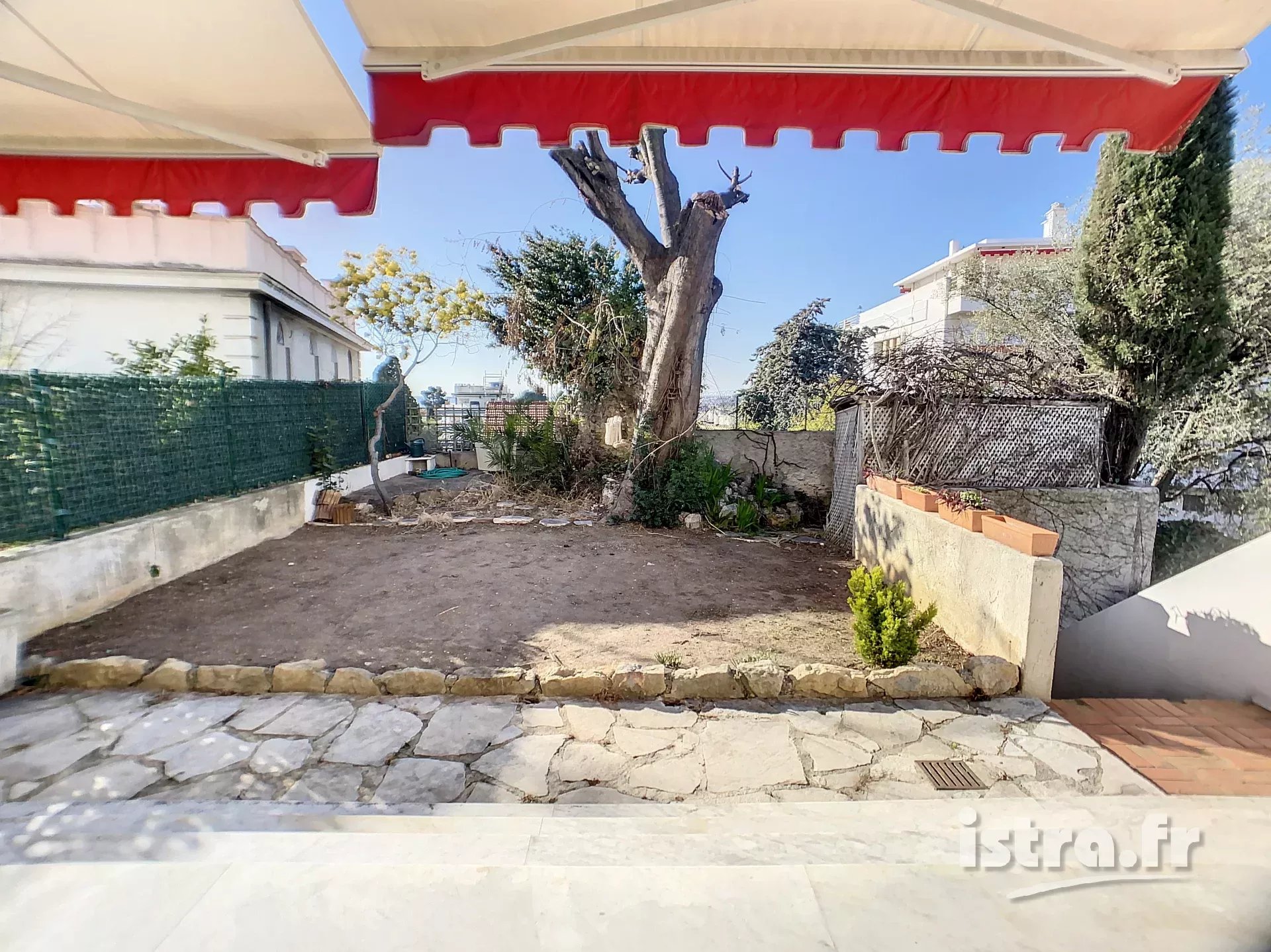 Nice Baumettes ‘Maeterlinck’ 4 pièces avec jardin et garage EXCLUSIVITE AGENCE ISTRA Nice quartier résidentiel des Baumettes, copropriété de standing avec parc. Appartement F4 avec jardin exposé sud, cave et garage. Cet appartement de 97,23m² dispose d’une triple exposition. Côté sud, il s’ouvre sur une terrasse de 13m² et un jardin de 65m² avec une échappée mer. Il comprend une entrée, un beau salon exposé sud/ouest de 31m² avec cuisine américaine et une suite parentale avec salle d’eau et rangements. Côté nord, 2 chambres, une grande salle bains et un balcon. S’y ajoutent plusieurs rangements et un wc séparé avec lave-main. Il s’agit d’un rez-de-jardin surélevé (1er étage avec ascenseur). Eau et chauffage collectifs. Volets et stores électriques côté sud, climatisation. Des travaux de rafraîchissement sont à prévoir. Le bien est vendu avec une cave dotée d’une mezzanine et un beau garage de plain-pied. La résidence est sécurisée par un portail et dispose d’un beau parc complanté. Il y a également un parking collectif à l’extérieur. L’ensemble immobilier ‘Les résidences Maeterlinck’ a été construit à partir de 1964, il est situé au 66 avenue des Baumettes, à l’emplacement de la villa ‘Les Abeilles’ qui appartenait au poète belge Maurice Maeterlinck. Grâce à son emplacement, vous bénéficiez de la proximité du bus (ligne numéro 38), du superbe parc naturel Estienne d’Orves, des écoles, collèges et lycées, de la Faculté de Droit, de l’accès aisé à la voie rapide … Bien soumis au statut de la copropriété (total de 217 lots dont 78 lots principaux). Provisions sur charges : 1.019.14 euros par trimestre. Taxe foncière annuelle 2068 euros. Honoraires d’agence à charge du vendeur Vous avez un projet immobilier à Nice Baumettes ? Vous envisagez de vendre un appartement ou une maison sur la colline des Baumettes ? Contactez l’agence Istra, votre agence immobilière préférée à Nice depuis 1993. Estimation gratuite. Tel. 04.93.97.2000 agence@istra.fr