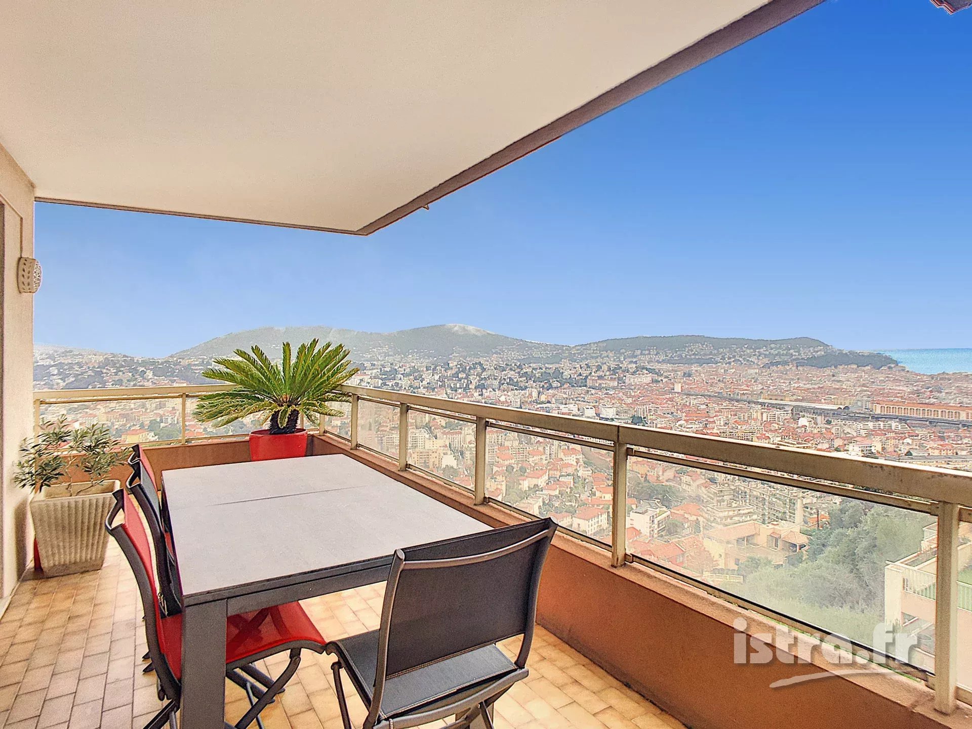 Nice Saint-Pierre de Féric > 4 pièces terrasse vue mer VENDU PAR AGENCE ISTRA Vous allez craquer pour cette grande terrasse et sa superbe vue à 180° sur la ville, les montagnes et la mer ! Dans le quartier de Saint-Pierre de Féric, à moins de 10 minutes en voiture du centre de Nice et du bord de mer, je vous propose ce beau 4 pièces dont la surface est de 100.32m² (dont 95.75m² en Loi Carrez) plus une superbe terrasse circulaire de 61.44m², une cave et un garage. Il s’agit d’une résidence de standing construite en 1983 à flanc de colline. L’appartement dispose d’une triple exposition. Il comprend une belle entrée avec des placards, une cuisine indépendante équipée récente, un beau salon d’angle de plus de 25m² avec 2 baies vitrées, une suite parentale avec salle de bain et toilette, 2 chambres (12.54 et 11.57m²) avec rangements, une seconde salle de bain avec fenêtre, et un wc séparé. Toutes les pièces s’ouvrent sur la terrasse avec une vue panoramique jusqu’à la mer. Le bien est climatisé avec des volets électriques. Il est en 2ème étage avec ascenseur et il est vendu avec une cave en rdc et un garage fermé. Tout en étant à l’écart de l’agitation de la ville, l’emplacement est bien desservi (lignes de bus n°64 et 75D) et à proximité des écoles, collèges et lycées. C’est une exclusivité de l’agence Istra. Bien en copropriété (54 lots). Provisions sur charges : 248 euros par mois. Taxe foncière annuelle : 1845 euros. Honoraires d’agence à charge du vendeur Vendez rapidement votre appartement à Nice. Demandez une estimation gratuite !